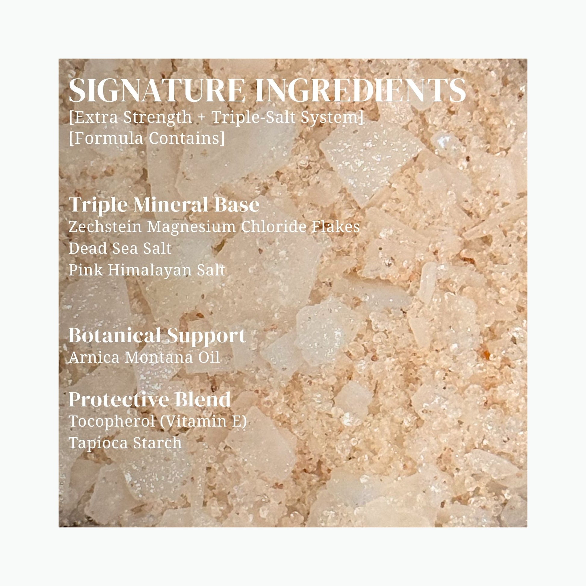 Trifecta is an Extra Strength bath soak created for muscle recovery after physical strain. This triple-salt blend — Zechstein magnesium, Dead Sea salt, and Himalayan salt — is elevated with Arnica oil to support overworked muscles, ease deep tension, and provide powerful relief. More than a simple soak, Trifecta delivers strength you can feel in every bath.